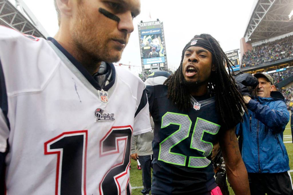 In this Oct. 14, 2014, file photo, the Seattle Seahawks’ Richard Sherman (25) talks with New England Patriots quarterback Tom Brady after the Seahawks won 24-23 at CenturyLink Field. (AP Photo/Elaine Thompson)