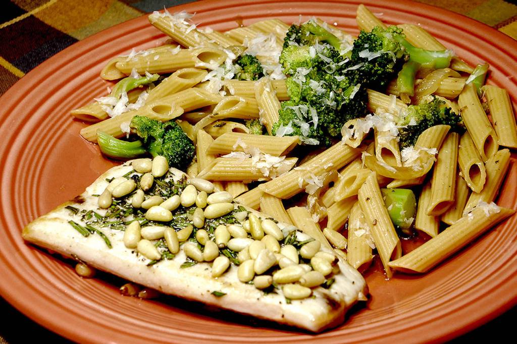 To buy: ¾ pound mahi-mahi, 1 package fresh rosemary or 1 bottle dried rosemary, 1 package pine nuts, 1 container fat-free no-salt-added chicken broth, ¼ pound broccoli florets, 1 box penne pasta, 1 lemon and 1 small piece Parmesan cheese.