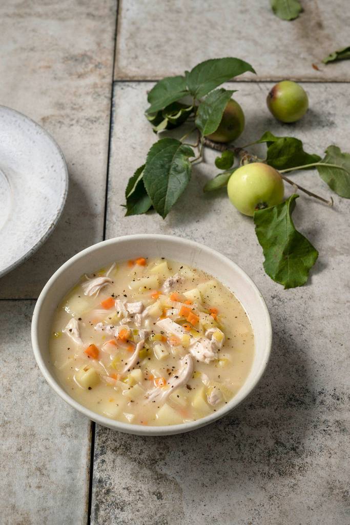 I decide to go for the creamy Norweigian “hunsekjuttsuppe” — chicken soup with apples. It’s apple season in the Northwest, and apples paired with leeks and parsnips in a creamy soup is the perfect cure for a grouchy, sniffly and downright blah feeling — especially if I add biscuits.