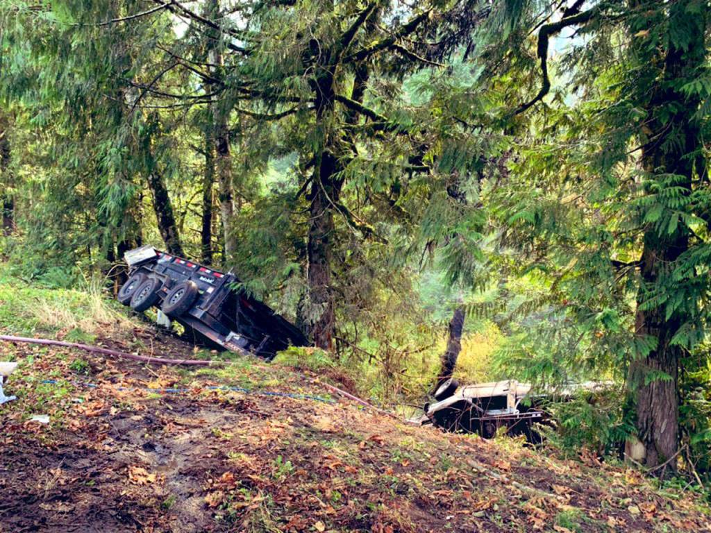 Around 12:30 p.m., a pickup truck towing a cargo trailer flipped and rolled 30 feet down an embankment. The two were trapped inside as the vehicle caught fire. Flames spread to trees and brush, but have since been extinguished.