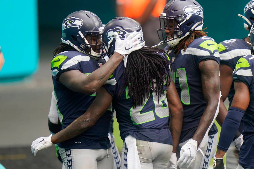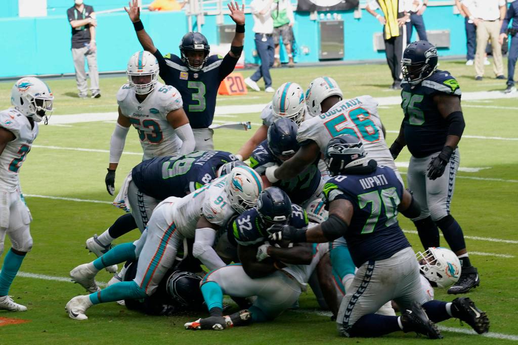 On their next possession, Wilson hit Metcalf with a 32-yard pass to the Dolphins 1, setting up Carson’s second touchdown to make it 31-15.