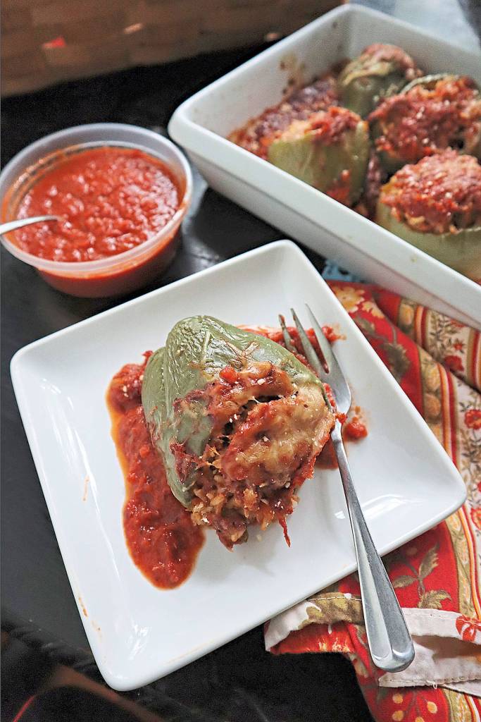 Peppers taste just as good filled with a savory mix of ground beef and cheese as they do with spicy or sweet sausage, tuna, grains or just vegetables. It’s the ultimate clear-your-fridge-or-pantry dish.