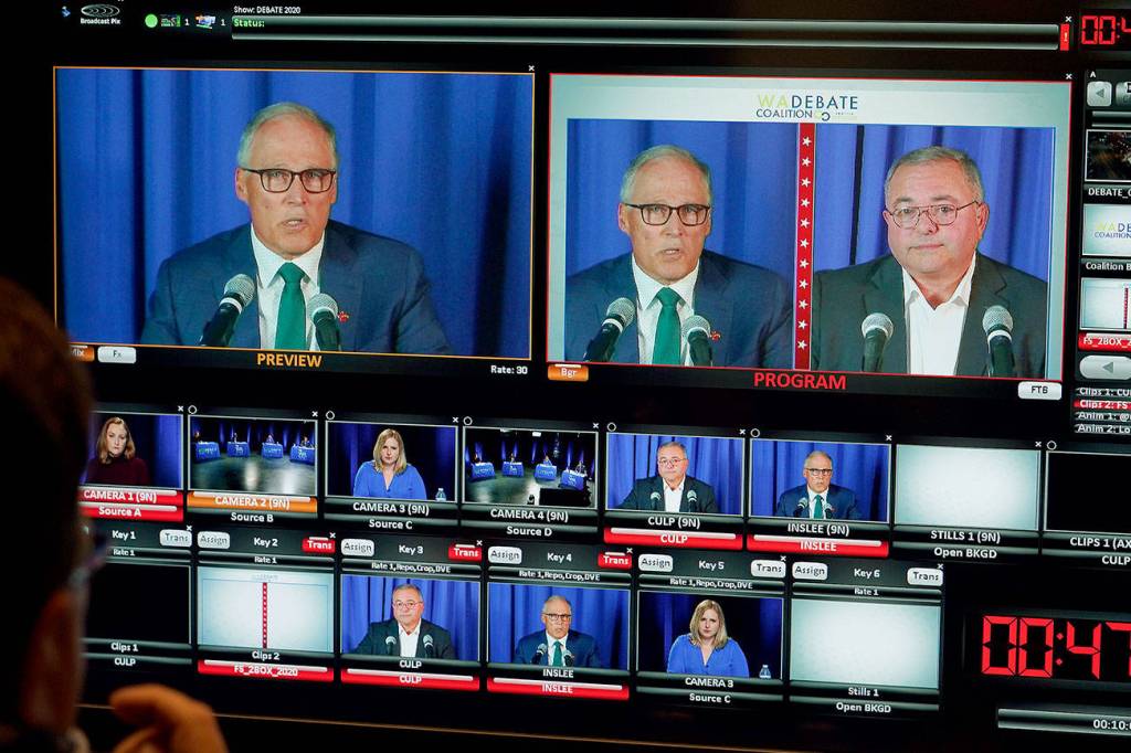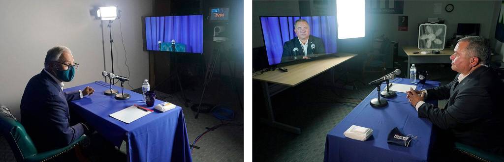 Though the pandemic kept them from sharing a stage — the men spoke from separate studios at TVW headquarters in Olympia — it didn’t deter the challenger from blasting the two-term incumbent’s handling of the state’s response to the coronavirus as too heavy-handed with a mask mandate and limits on the pace at which he allows counties to reopen their economies and people to regain a degree of normalcy in their daily lives.