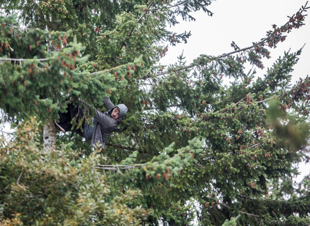 Witnesses saw a man climbing a tree near Highway 527, near a crane and rigging business. Troopers, sheriff’s deputies and Bothell police surrounded him. He was about 60 feet above the ground.