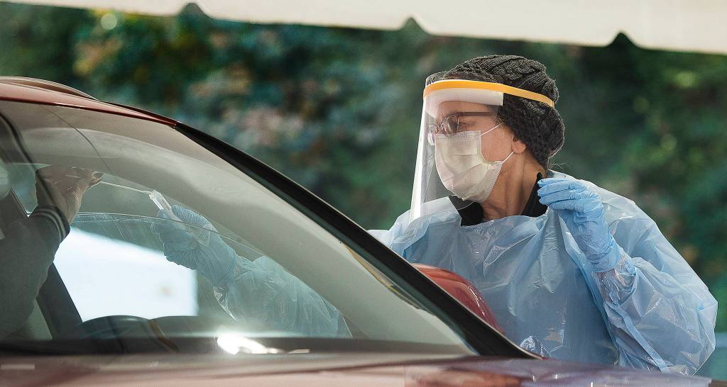 Volunteer registered nurse Stephanie Hamilton receives a swab from a driver as she works at a COVID-19 testing site in the parking lot at Everett Memorial Stadium on Tuesday. (Andy Bronson / The Herald)