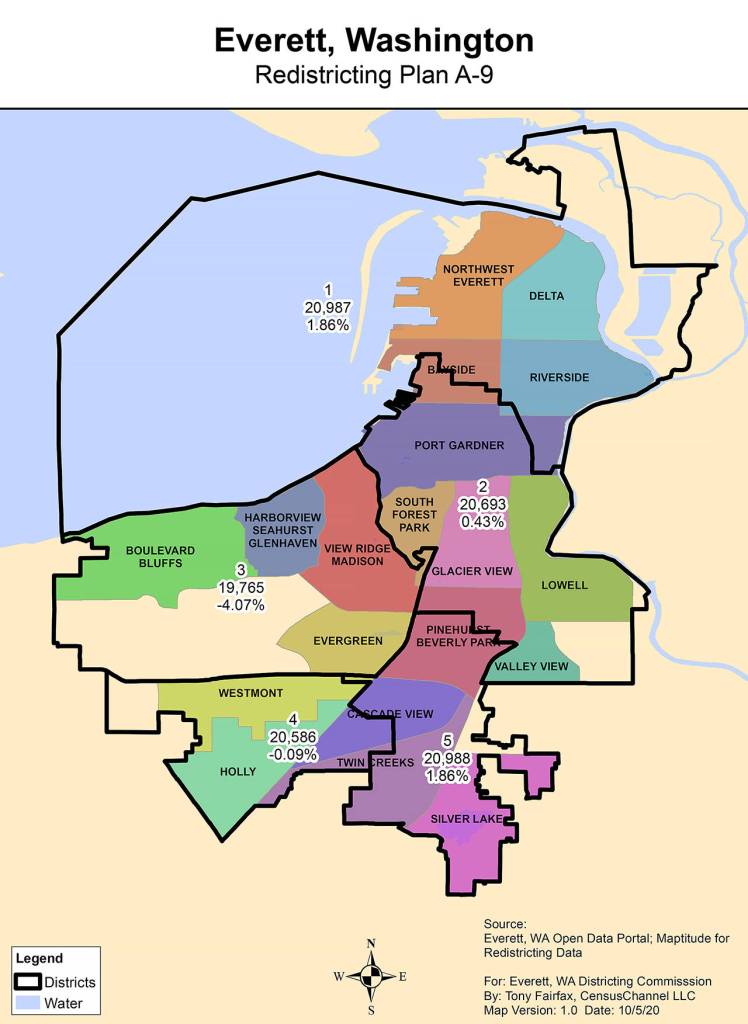 Map A-9 is a slight revision of the one proposed this summer during public comment sessions. Precinct 40, which runs southeast of Evergreen Way and along Dorn Avenue to Everett Mall Way in the Cascade View neighborhood, was moved from District 4 into District 5 to account for projected growth and lower the population deviation across the map.