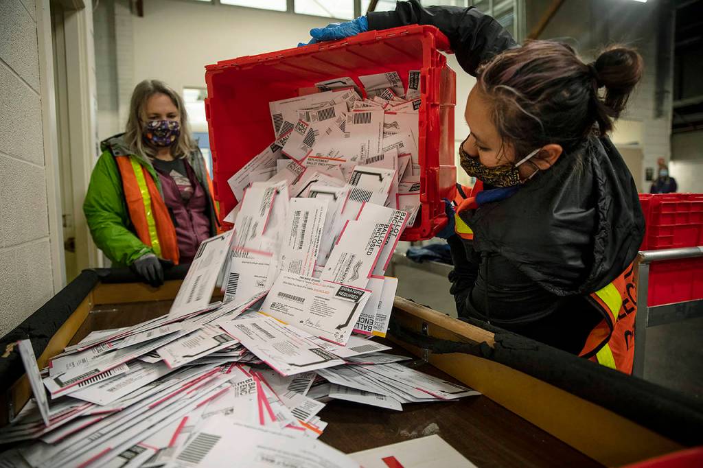 Election worker Kristen Mun from Portland empties ballots from a ballot box at the Multnomah County Elections Division, Tuesday, Nov. 3, 3030 in Portland, Ore. Oregon is the first state in the nation to institute voting by mail and automatic voter registration. (AP Photo/Paula Bronstein)