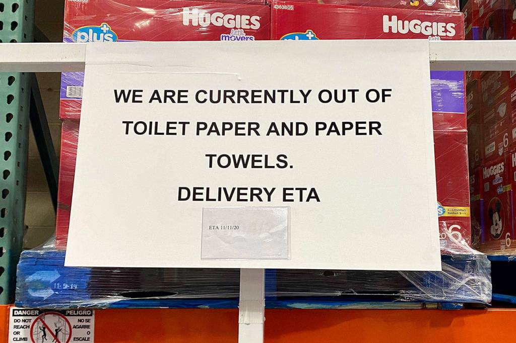 At one point on Tuesday, those swarming the paper roll aisle of the Lynnwood Costco left without their fix. The store was out of toilet paper and paper towels. Despite frequent shipments, the mounds of paper disappear fast, even with a limit of one per customer.