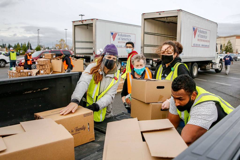 At the first drive-through pantry Nov. 13, more than 2,000 boxes of food were given to 340 families — 1,638 adults and children, said Cory Armstrong-Hoss, Volunteers of America Western Washington’s director of communications and marketing.