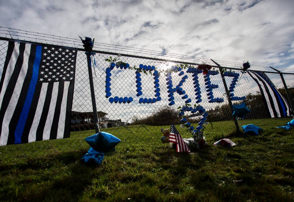 TULALIP — Blue cups spell out “Cortez” in the holes of a chainlink fence. A light breeze billowed two “thin blue line” flags Thursday at the makeshift memorial for Tulalip Tribal Police officer Charlie Cortez.