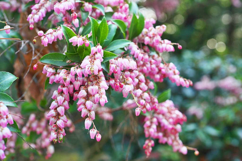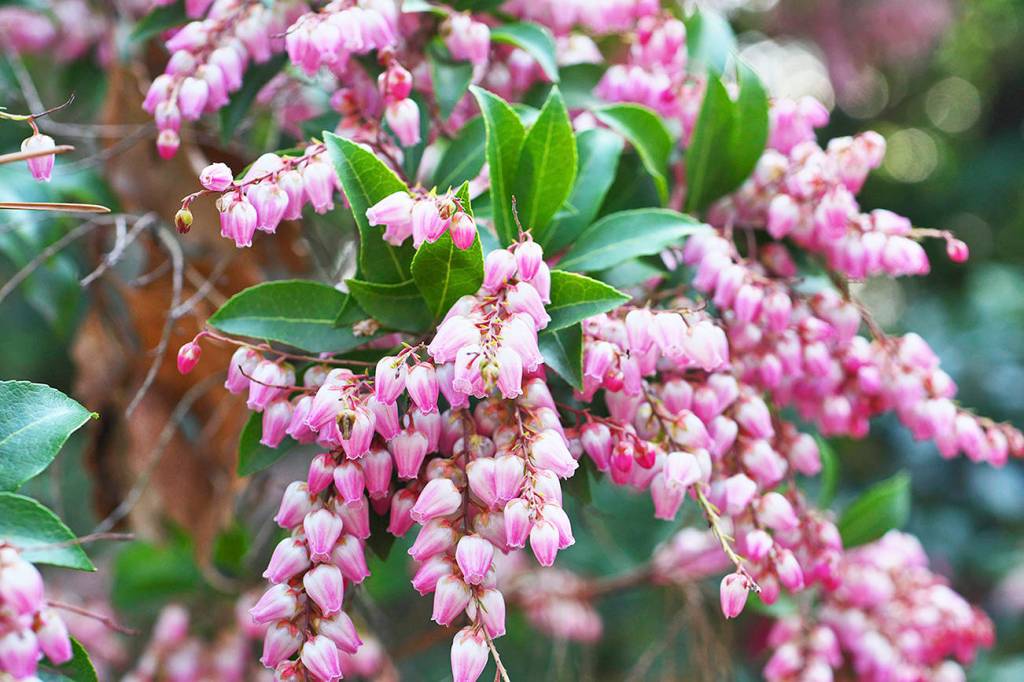 Pieris japonica: All forms of Japanese andromedas are landscape workhorses for Northwest gardeners. They start showing their buds in late fall and will color-up as early as January or February — the flower colors range from pure white to dark pink and red. The newer forms like the Tiki series from Monrovia are more compact and better-suited for our smaller gardens.