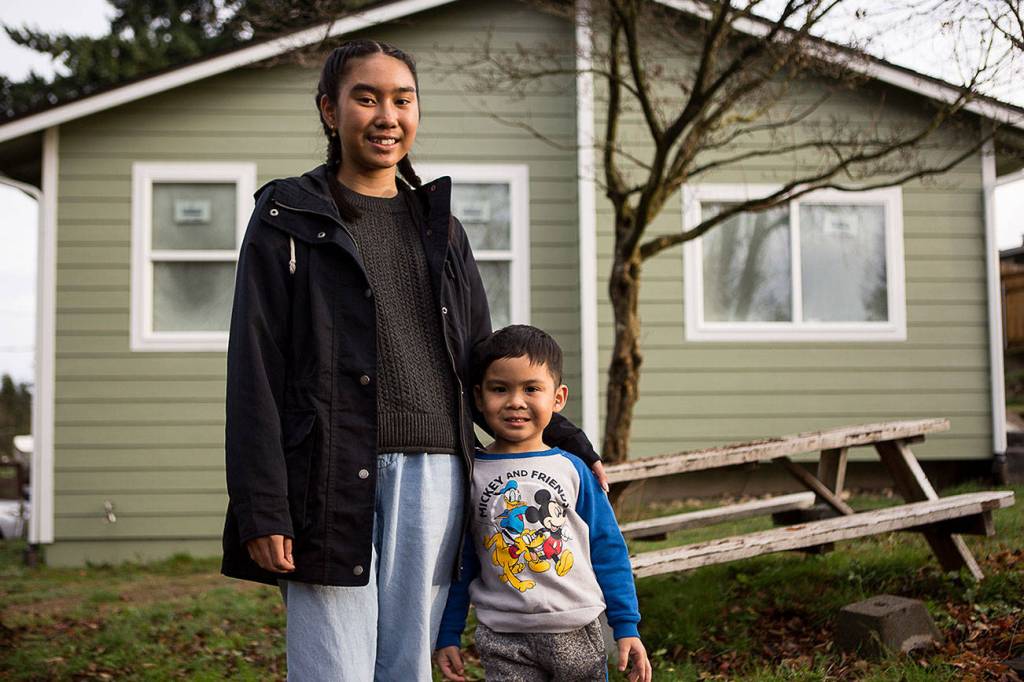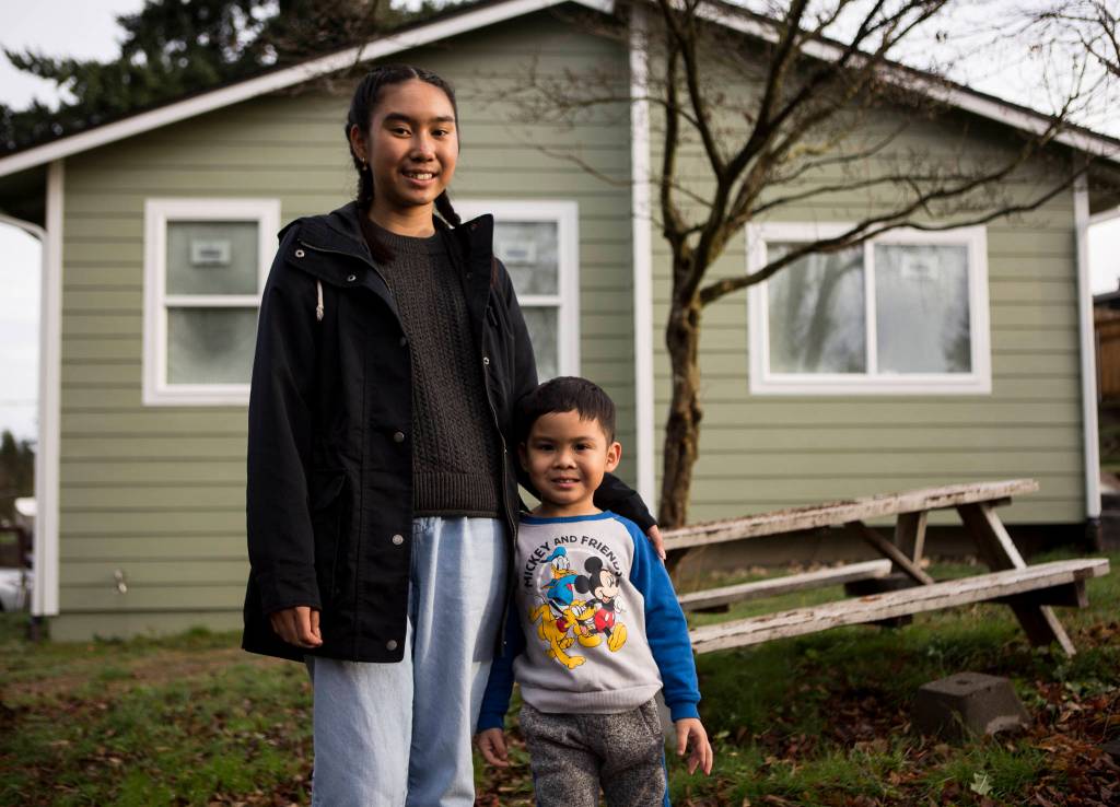 Myli Maytrichith, 12, with little brother Tyson, 4, outside of their home that is currently being rebuilt after catching fire last March on Thursday, Dec. 10, 2020 in Everett, Wa. (Olivia Vanni / The Herald)