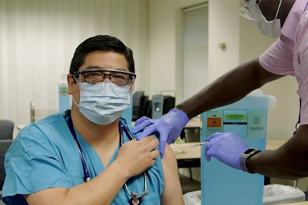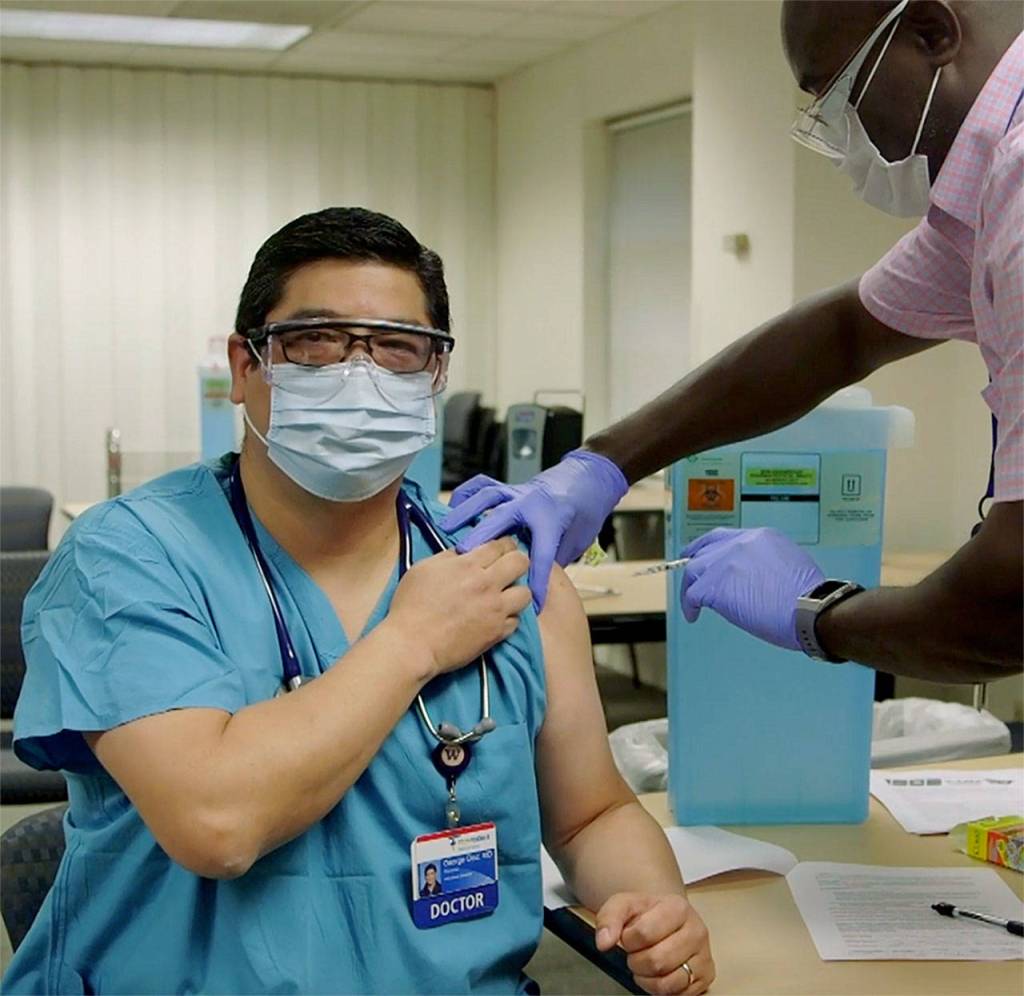Dr. George Diaz, the Everett hospital’s section chief for infectious diseases, was among the first in line to receive the first of two doses required for the Pfizer vaccine — nearly a year after he treated the country’s first diagnosed COVID patient, in January.