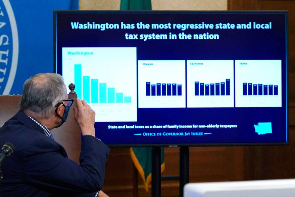 Gov. Jay Inslee looks toward a chart comparing Washington state’s tax system to other Western states as he talks to reporters, Thursday at the Capitol in Olympia. Inslee is proposing a new capital gains tax and a tax on health insurers as part of his two-year budget proposal that seeks to offset the revenue losses the state has seen during the ongoing coronavirus pandemic and to help bolster the state’s public health system. (Ted S. Warren / Associated Press)
