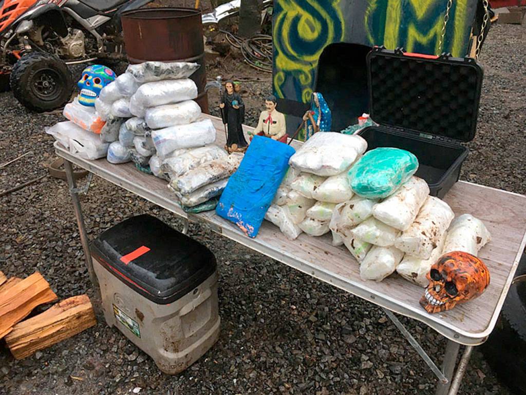 The next day, agents turned their attention to a pile of freshly cut logs that seemed out of place. Under the stack and under a couple feet of dirt, investigators dug up a plastic tub, a cooler and a bucket sealed with red duct tape. Inside were about 47 pounds of meth.