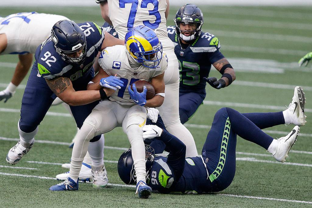 The signature moment came in the third quarter. Seattle opened the second half with a touchdown to take a 13-6 lead. L.A. answered by driving inside the Seahawks’ 10, and another tie score seemed inevitable. But between Adams tracking Darrell Henderson down from behind to prevent a sure TD and linebacker K.J. Wright blowing up the play on fourth-and-goal from the 1, Seattle produced a five-play goal-line stand every bit worthy of the defenses that took the Seahawks to the Super Bowl in the 2013 and 2014 seasons.