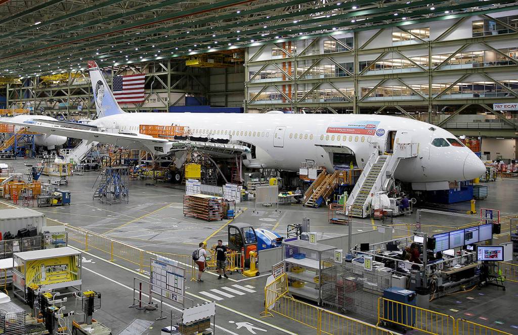In this 2017 photo, a Boeing 787 airplane is shown at Boeing’s assembly facility in Everett. (AP Photo/Ted S. Warren, File)
