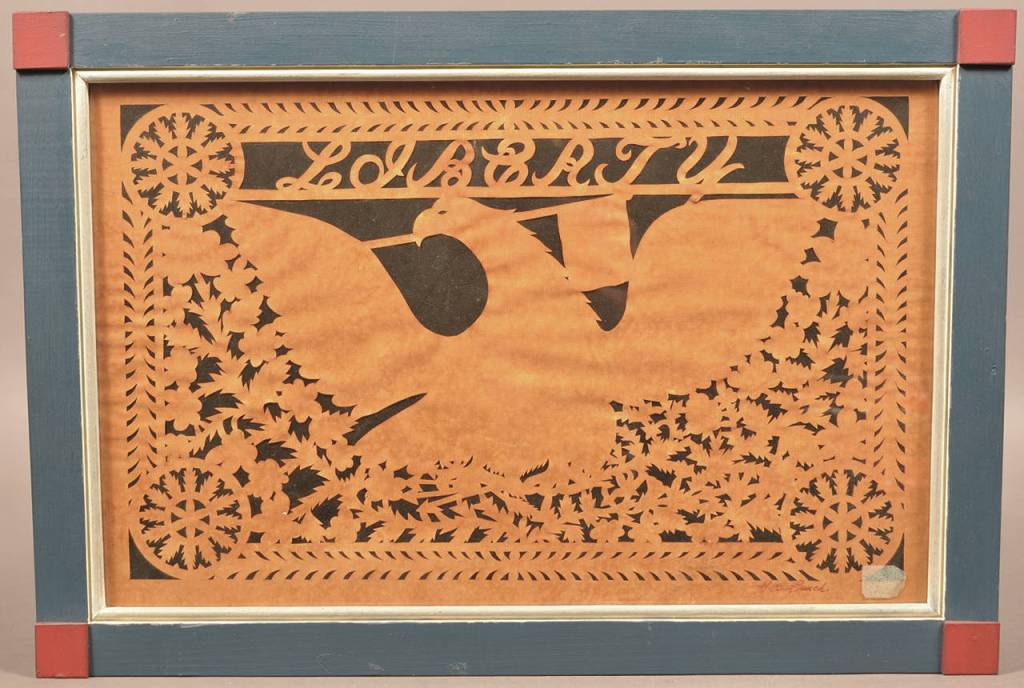 We were surprised to learn that the scherenschnitte was made in the 20th century. The earliest we have heard about was sold in 2013. There are contemporary artists making and selling pieces that are made of plain paper or are cut paper pictures with added paint. But we have not learned who G.B. French was. The old schnerenschnitte pictures sell for about $500 to $800, but the piece pictured here and identified as 20th century brought only $40 at a Hess Auction Group sale.