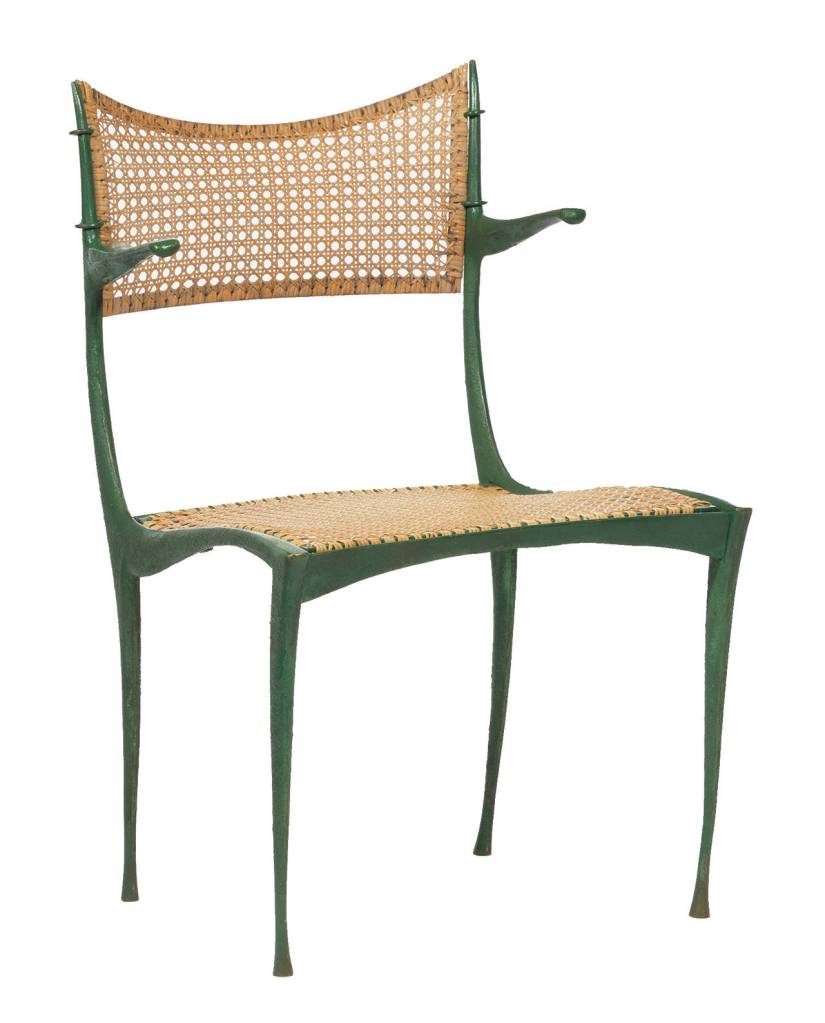 Johnson often used thin, patinated metal, iron or aluminum for arms, legs and seats, and added caning or fabric upholstery. All of his designs looked lightweight, but a chair with a bronze or iron frame is heavy and hard to shove into place at a dining-room table. One of his most famous designs was the Gazelle line designed in Rome and then sold in the U.S. He used metal parts patinated “Pompeian Verde,” a green color that was inspired by the excavations at Pompeii.