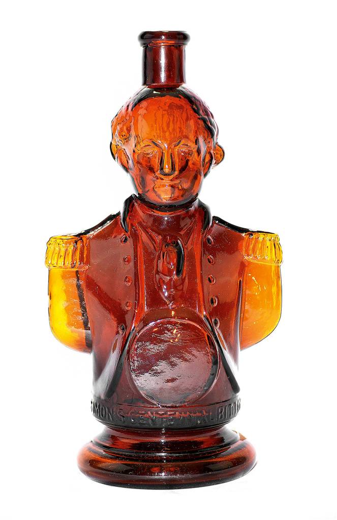 Glass Works Auctions sold the amber “Simon’s Centennial Bitters, Trade Mark” bottle at their auction for $2,640. It is shaped like the bust of President Washington with the product name embossed on the front below a large, round label panel.