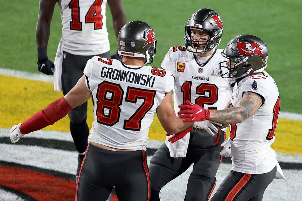 Brady accomplished a career-first when he tossed an 8-yard TD pass to Gronkowksi to give the Buccaneers a 7-3 lead with 37 seconds left in the first quarter. Brady’s nine Super Bowl teams in New England produced just three points total in the first quarter. Gronkowski, who came out of retirement to play with his buddy, caught his 13th and 14th postseason TDs from Brady. That broke the record they shared with Jerry Rice and Joe Montana, who combined for 12.