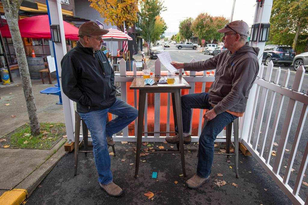 Scott McEntire and Jim Coe enjoy a drink and lunch in an outdoor seating tent at the Salish Sea Brewing Co. along Dayton Street on Monday, Oct. 12, 2020 in Edmonds, Washington.  (Andy Bronson / The Herald)
