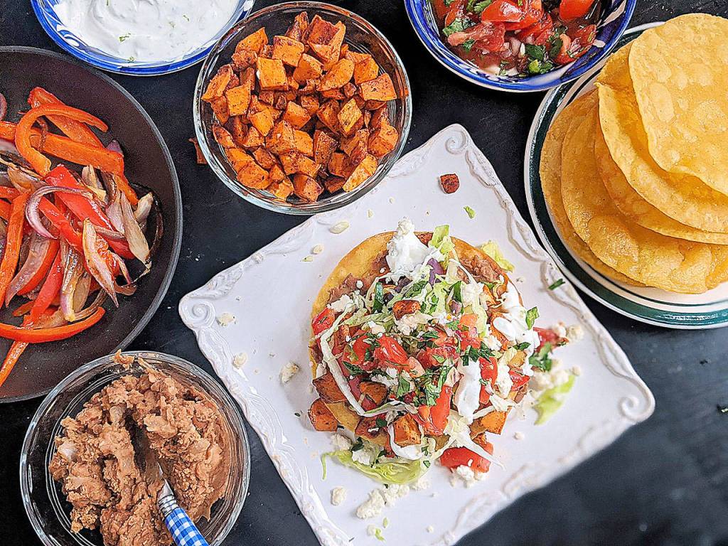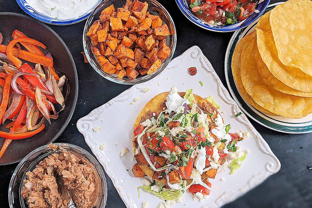 These vegetarian tostadas are stacked with two layers of smashed pinto beans, lettuce, pico and roasted sweet potatoes and bell peppers. Crumbled queso fresco and lime crema add the crowning touch. (Gretchen McKay/Pittsburgh Post-Gazette/TNS)