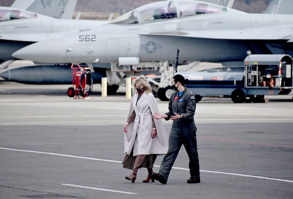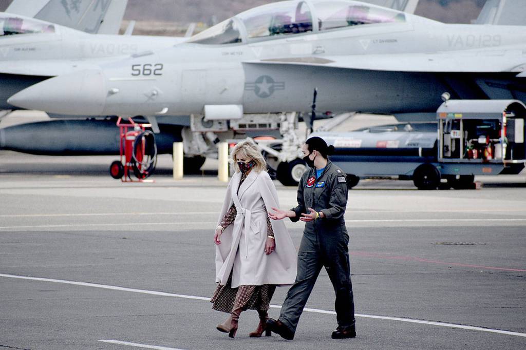 First lady Jill Biden (left) at Naval Air Station Whidbey Island on Tuesday. (Emily Gilbert / Whidbey News-Times) 20210309