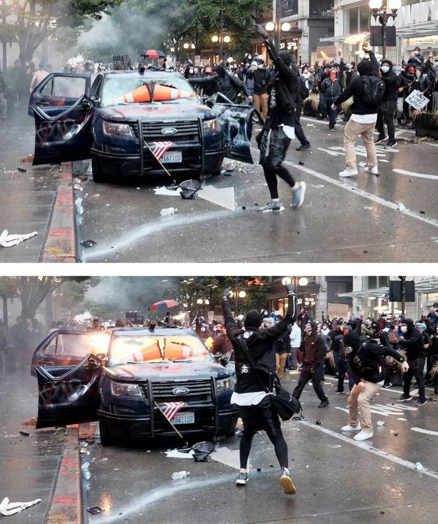 “Unlike the vast majority of demonstrators who came to downtown Seattle to protest peacefully against systemic racism, this defendant came armed with Molotov cocktails — intent on dangerous destruction,” said Acting U.S. Attorney Tessa Gorman. “The danger to others is captured in pictures from the scene: flames from the burning car and burning gasoline spread across the sidewalk, pollutant-filled smoke billowing into the crowd. This isn’t free speech — it is criminal conduct deserving of a federal prison sentence.”