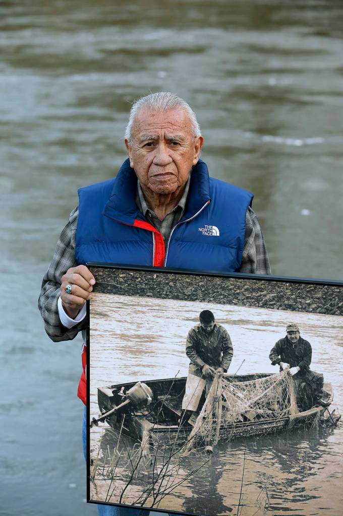 In this Jan. 13, 2014 photo, Billy Frank Jr., a Nisqually tribal elder who was arrested dozens of times while trying to assert his native fishing rights during the Fish Wars of the 1960s and ’70s, holds a 1960s photo of himself (left) fishing with Don McCloud near Frank’s Landing on the Nisqually River. (AP Photo/Ted S. Warren, File)