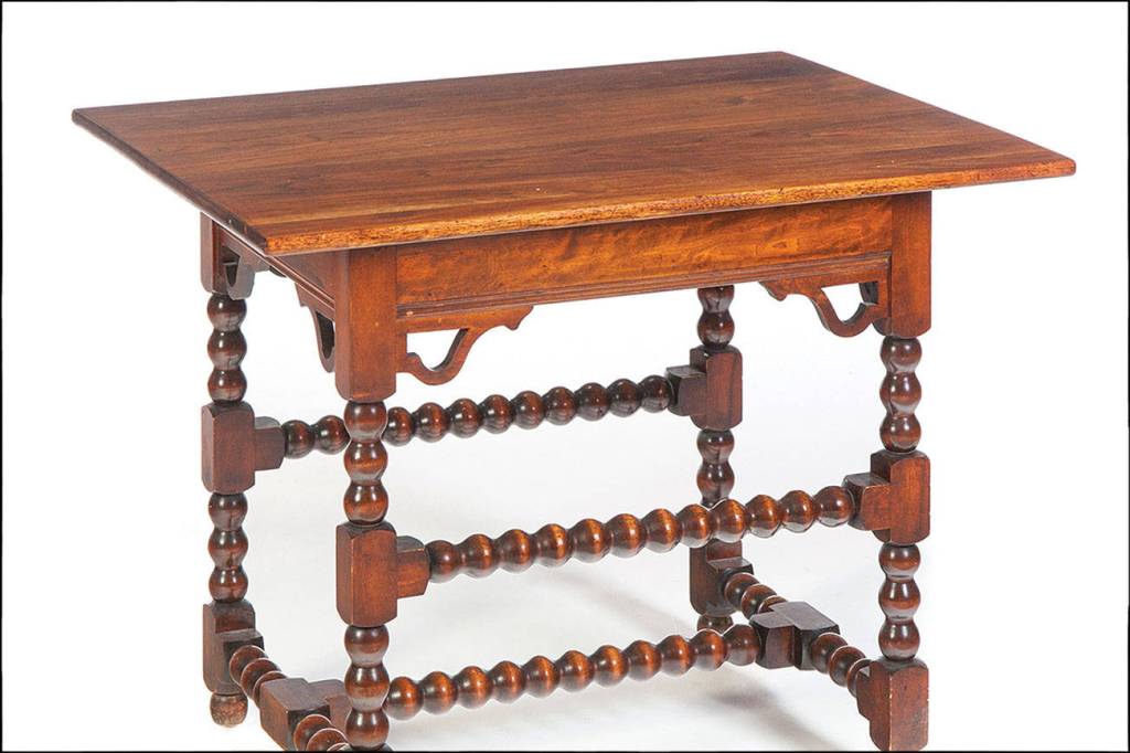 A 20th-century reproduction Nutting tavern table was sold by Garths Auctioneers and Appraisers a few years ago for $469. It is short, has an apron, turned legs and a box stretcher. This type of table was used as a serving table in the tap room of Colonial taverns.