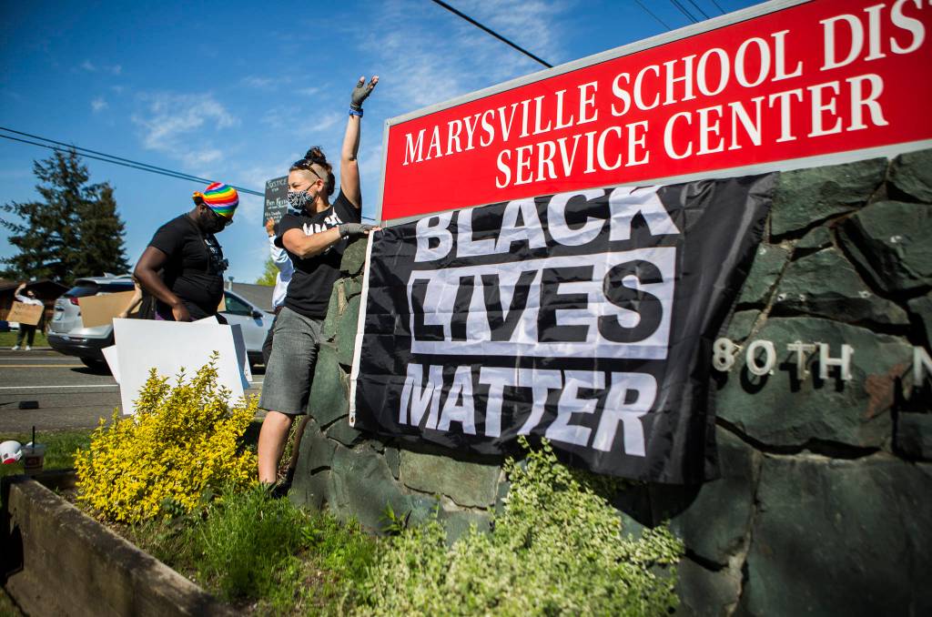 Gus Underfoot hangs a Black Lives Matter flag underneath the Marysville School District sign during a protest on Wednesday. (Olivia Vanni / The Herald)