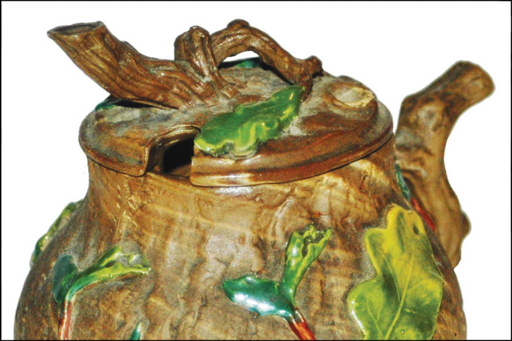 Collectors since the 1970s pay the highest prices for the pre-fire pieces. “Earlyware Relief” pieces were made before 1880. They were formed in a mold, often to look like a tree trunk and sometimes tan colored. Molded pieces resembling vines were added and colored green or brown with platinum accents. Mettlach marks tell the story of a piece, with as many as nine marks on a piece.