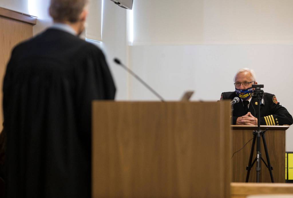 Well over a dozen retired firefighters in formal dress attire down to their shiny black shoes fanned out over a makeshift courtroom designed to accommodate a large socially distanced gathering.