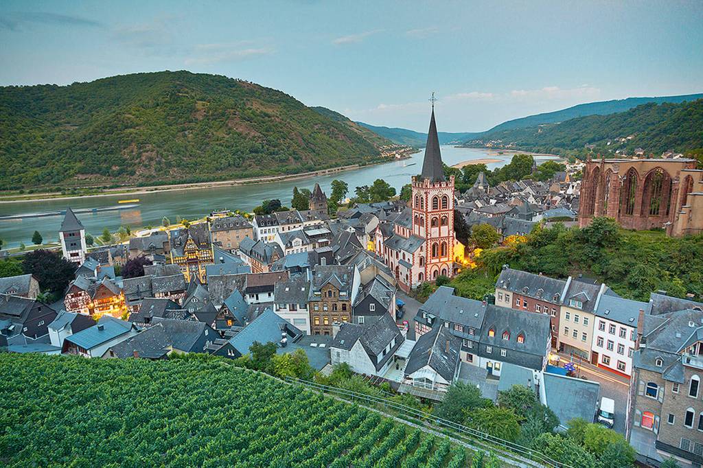 Cruising down the romantic Rhine River, we dodge the treacherous reefs that spelled disaster for ancient sailors distracted by the fabled Lorelei siren. We dock at the half-timbered town of Bacharach, where I jump out. Bacharach, wearing a castle helmet and a vineyard cape, is a typical Rhine village. It lines the river and fills its tiny tributary valley with a history you can hook arms with in a noisy Weinstube.