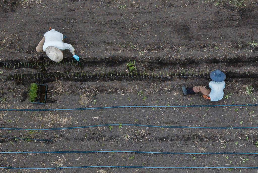 Libby Reed (left) and Patrick Lehr plant red cipollini onions at Orange Star Farm near Monroe. Snohomish County is the only one of Washington’s three most populous counties that still has significant farmland. (Olivia Vanni / The Herald)