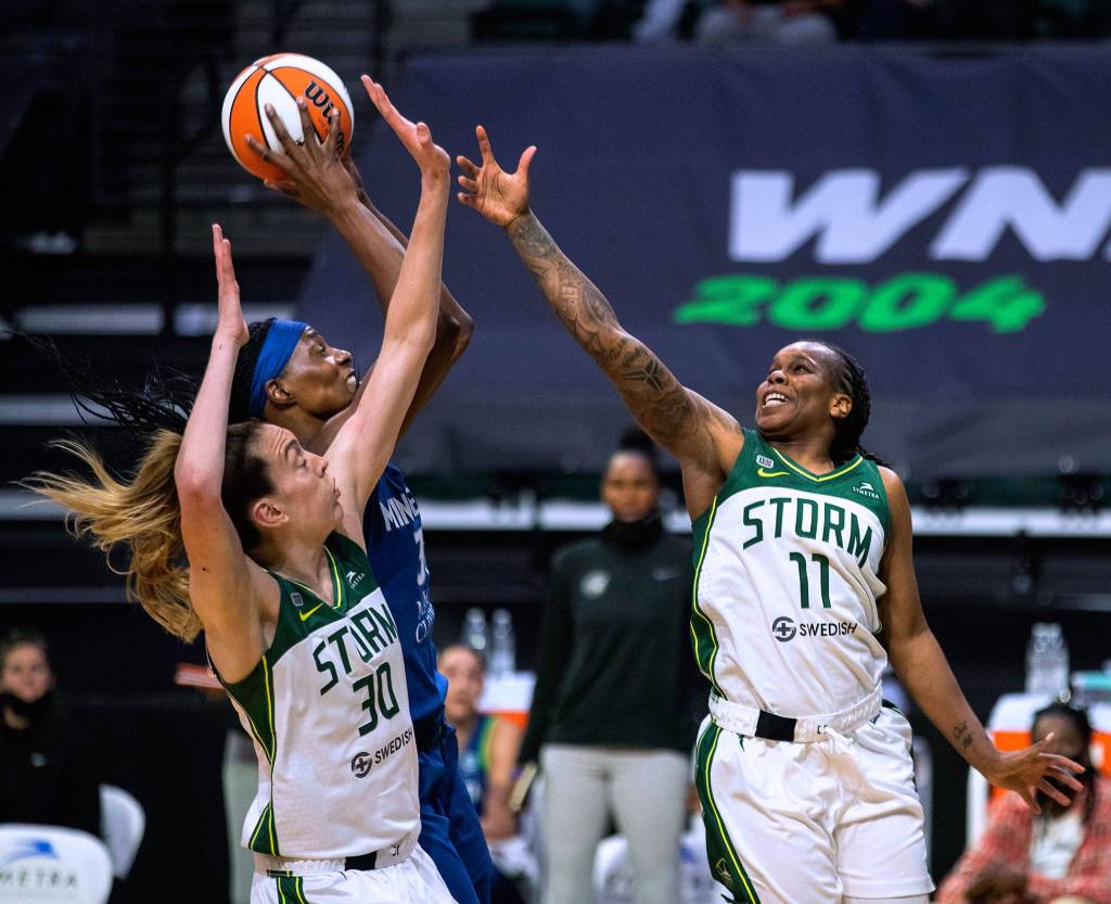 Minnesota Lynx center Sylvia Fowles center gets the rebound and the putback during the first quarter, besting Seattle Storm's Breanna Stewart, left, and Epiphanny Prince (11) of a WNBA basketball game Friday, May 28, 2021, in Everett, Wash. (Dean Rutz/The Seattle Times via AP)