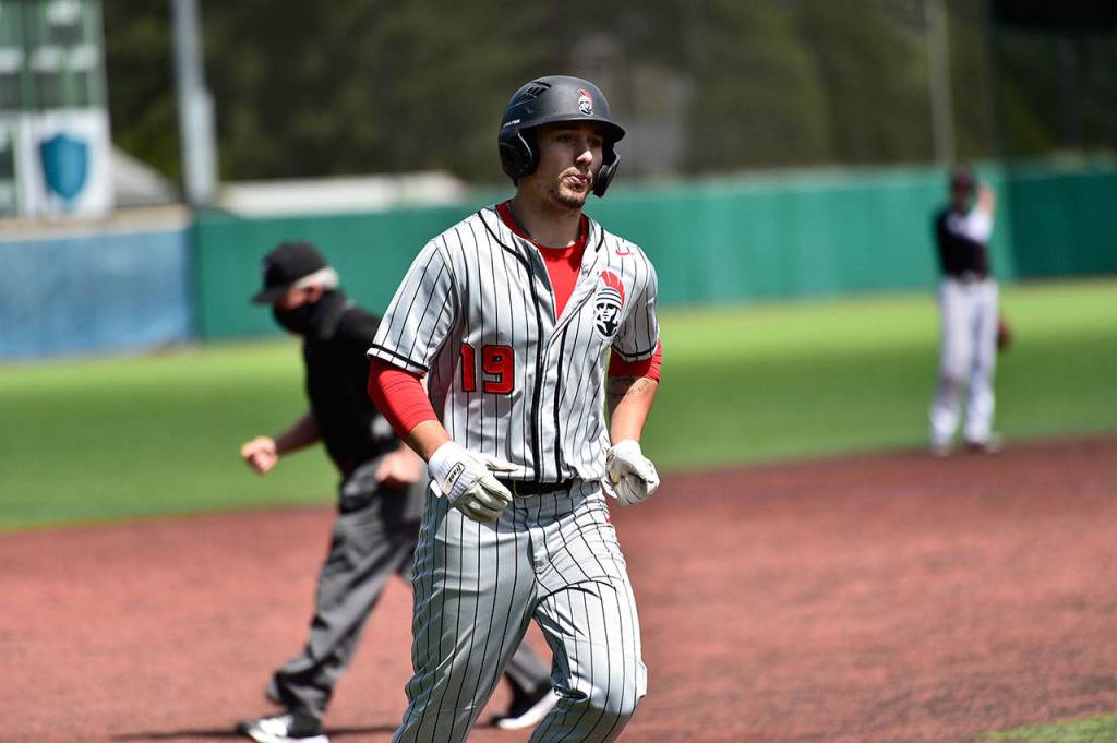 Everett Community College’s Jordan Justice, a Marysville Pilchuck High School graduate, rounds the bases after slugging a home run in the Trojans’ 9-4 victory over Skagit Valley on May 2 at Edmonds College. (Daniel Acosta / Everett Community College)