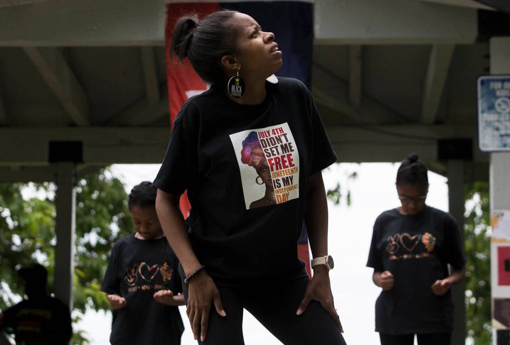 Junelle Lewis becomes emotional while performing a dance with her children during the Justice to Jubilee Juneteenth Celebration at Skykomish River Park on Saturday, June 19, 2021 in Monroe, Wa. (Olivia Vanni / The Herald)