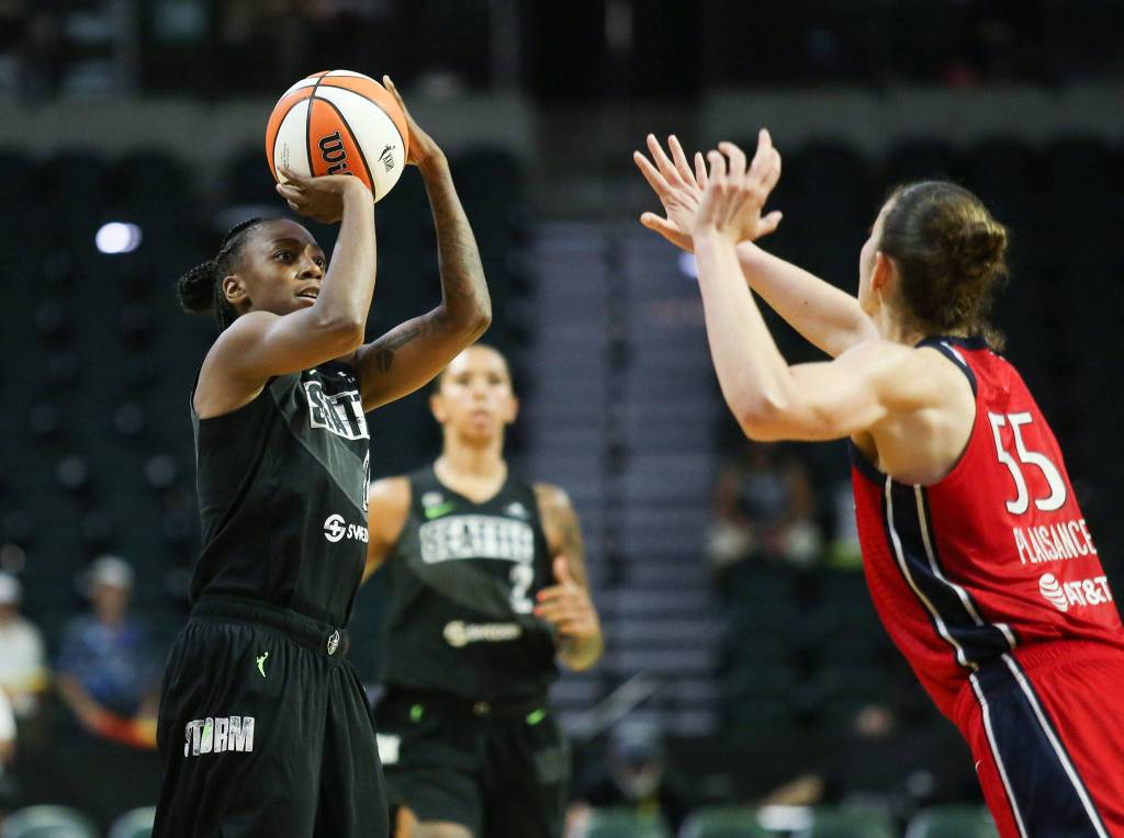 The Storm’s Jewell Loyd shoots against the Mystics on Tuesday at the Angel of the Winds Arena in Everett.