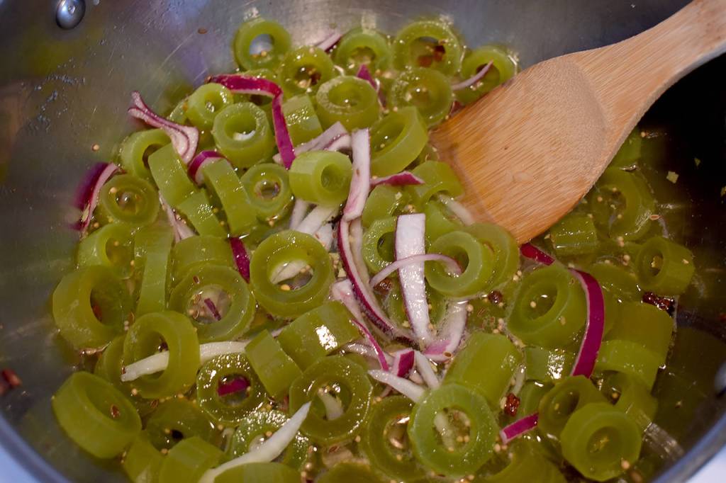 Hahn has been eating seaweed for about 40 years, and her Pacific Northwest-inspired cookbook tells aspiring chefs how to prepare it. Her bull kelp pickle recipe is inspired by the kelp picklers she met in Alaska. The result is a batch of golden rings that are tangy and sweet with a satisfying crunch.