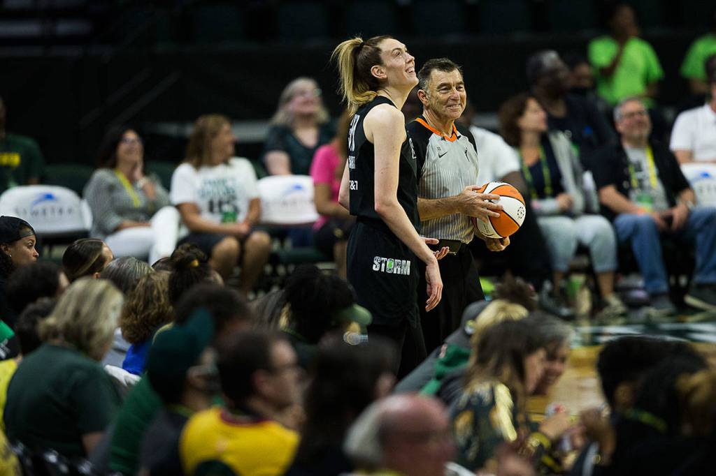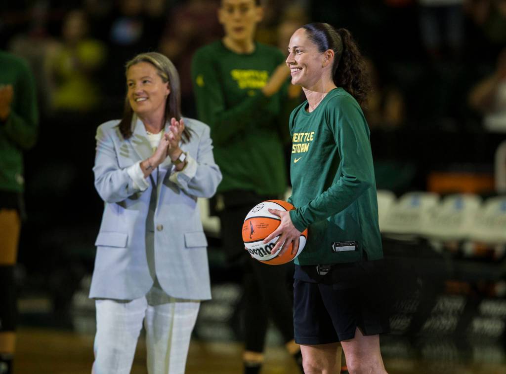 Seattle Storm’s Sue Bird receives a basketball Sunday in Everett honoring her achievement of becoming the only player in league history to amass 3,000 career assists.