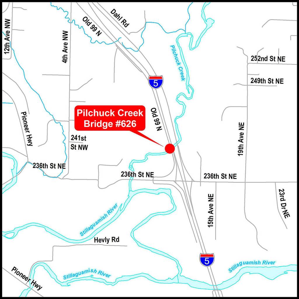 In April county employees found a hole in the concrete deck of the Old Highway 99 bridge that spans 181 feet and is 24 feet wide. They installed a steel plate to cover the gap on the crossing about 20 feet above Pilchuck Creek, but the steel girders were not affected, Snohomish County Public Works spokesperson Julie Kuntz said in an email.