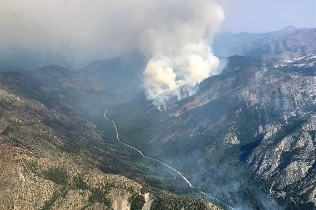 This July 11 photo, taken from an aerial attack plane, shows the Varden Fire (large plume at top) burning south of Highway 20 near Winthrop, and the Delancy Fire (lower right) north of the highway. (U.S. Forest Service)