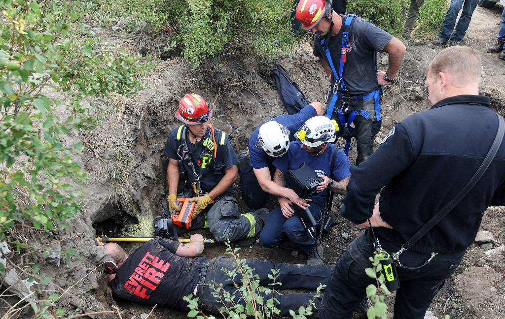 The Everett Fire Department initially reported the tunnel “may have collapsed.” Authorities later realized the tunnel was intact but covered, Doniger said. Crews removed the dirt from the top of the tunnel’s apparent entrance.