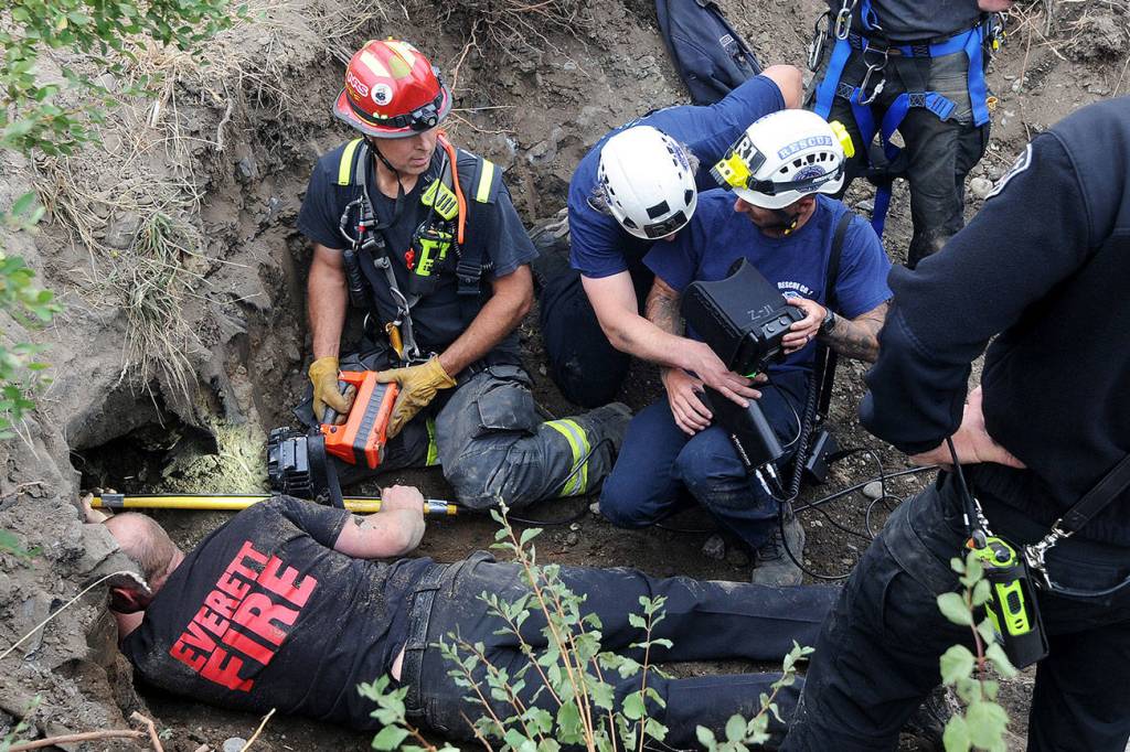 EVERETT — Dozens of firefighters responded Thursday morning to an I-5 off-ramp in Everett after a report that a person might be stuck in a collapsed tunnel that had been dug as an apparent shelter.
