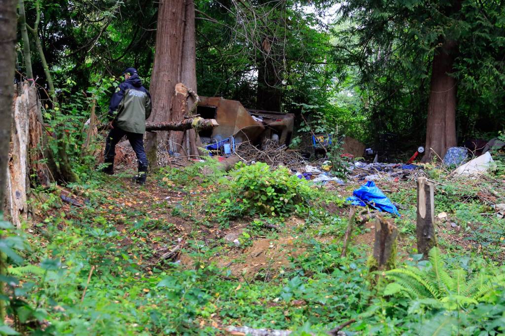 In September 2020, a man living in the camp dug a hole at random to bury some garbage, just out of view of office buildings on the other side of 130th Street SE. In the ground, the man found what he later called a “big bone,” said Dave Bilyeu, a major crimes detective with the Snohomish County Sheriff’s Office.