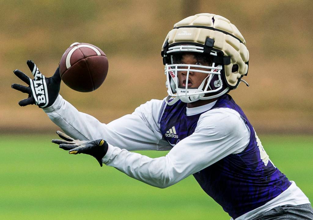 Glacier Peak’s Jadon Claps reaches out for the ball to make a catch during the Cougars Championship Passing Tournament at Lakewood High School on July 31 in Arlington. (Olivia Vanni / The Herald)