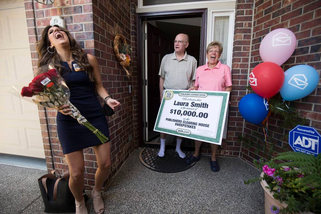 Tom Smith was going to go solo to the door. Then he saw the PCH logo balloons through the window. So he made her come, too, just in case he wasn’t seeing things. That’s why it took a few long minutes. No, they didn’t stop to comb their hair. They’re not the types to slum around all day. It’s almost as if they’re always ready for the Prize Patrol to come knocking.