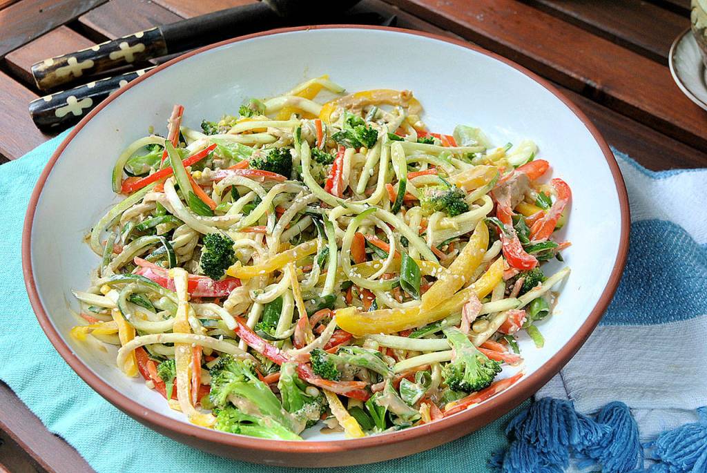 It starts with zoodles — long, raw zucchini noodles made with a spiralizer or vegetable peeler. They’re tossed with sliced bell peppers, charred broccoli, shredded carrot and green onion, then dressed in a dressing made with tahini, rice vinegar, ginger and soy.